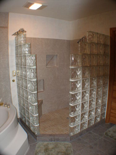 Wood is not all I have. I have been a tile craftsman for most of my life. Lately there has been more requests for the tile walk in showers. I can make the most of your space and make it more exiting than a fiberglass unit like the one I removed from this bathroom for Diana. Now theres room for two, complete with two showerheads, body jets, all tile floor pan and glass block walls. She says the kids can't wait to get in now and they can shampoo the dog too.